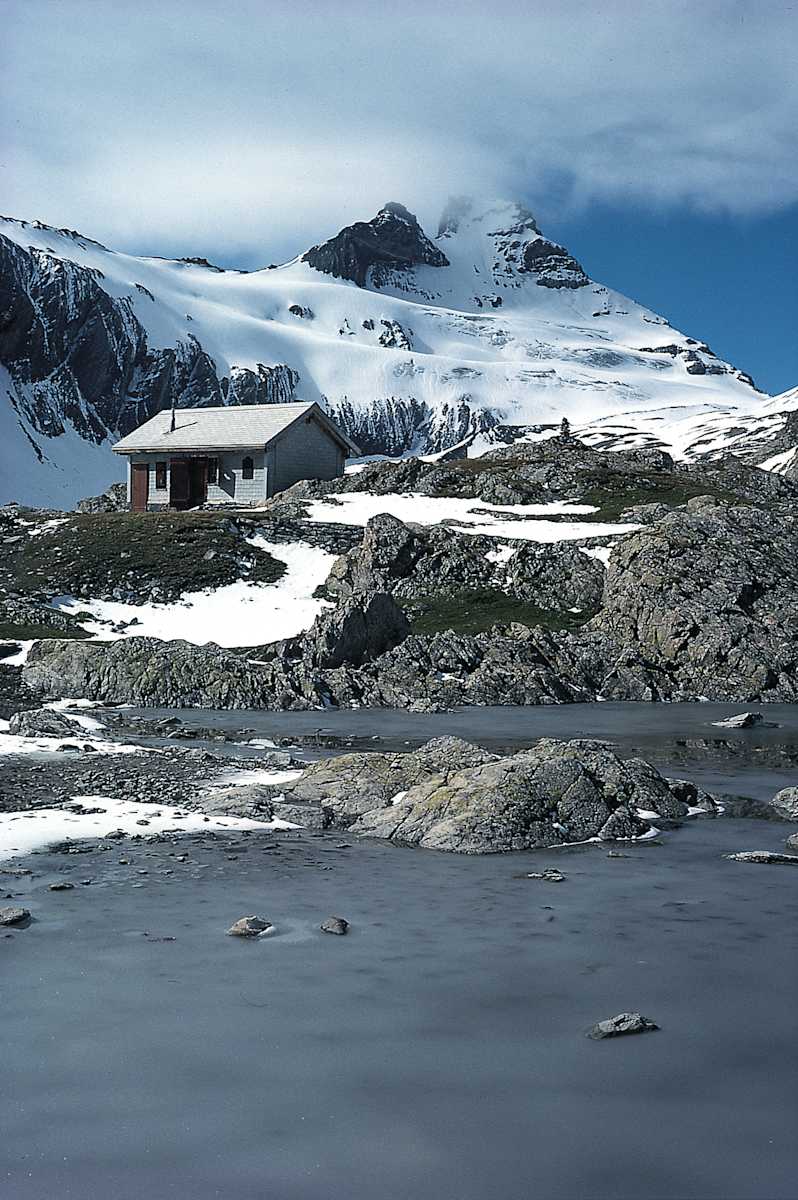 Nach rechts hinüber bezwingt der Weg die nächste Steilstufe, führt durch ausgedehnte Geröllhalden zur schluchtartigen Gurglen und erklimmt den Boden des winzigen Häxenseelis. Dort wie im Gurglen können sich bis in den Hochsommer hinein ansehnliche Altschneefelder halten. Rechts am Hexenseeli vorbei erreicht der Weg schließlich die kleine, stets offene Panixerpass-Schutzhütte (2.407 m). Markant ragt dahinter der vergletscherte Hausstock empor.
