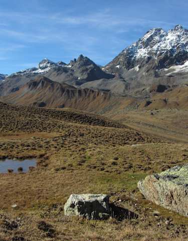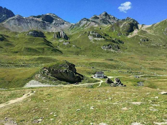 Bei Scuol nimmt man die Seilbahn, die „Motta Naluns“, bis zur Bergstation. Von dort geht es auf einem Steig, zunächst über Wiesen und dann über ein Steinfeld hinauf zum Fuocla Champatsch (2.730 m). Weiter folgt man dem Wanderweg hinunter ins Val Davo Lais und geht über saftige Bergwiesen, vorbei am gleichnamigen Gebirgsee, wo der Pfad wieder ansteigt. Schließlich erreicht man den Übergang, die „Fuorcla“ zwischen Piz Davo Dieu (2.889 m) und Piz Davo Lais (3.027 m) und genießt die grandiose Aussicht.
