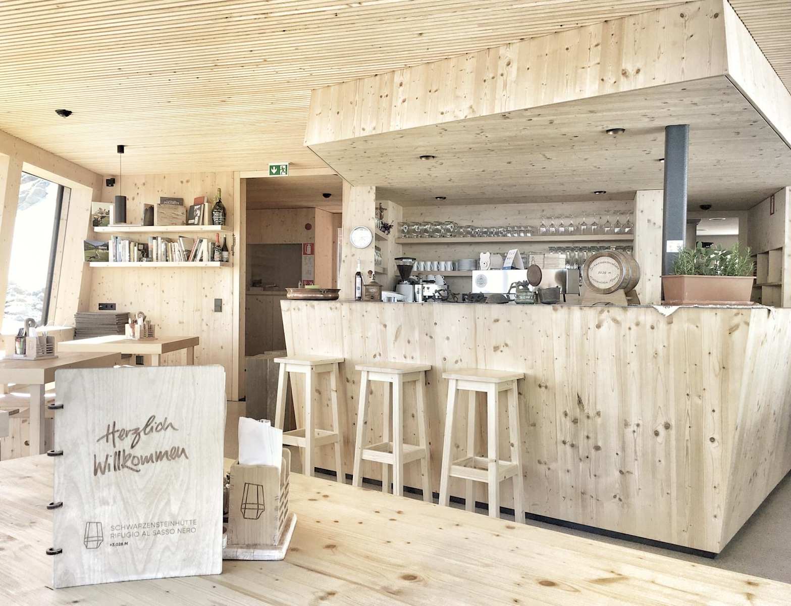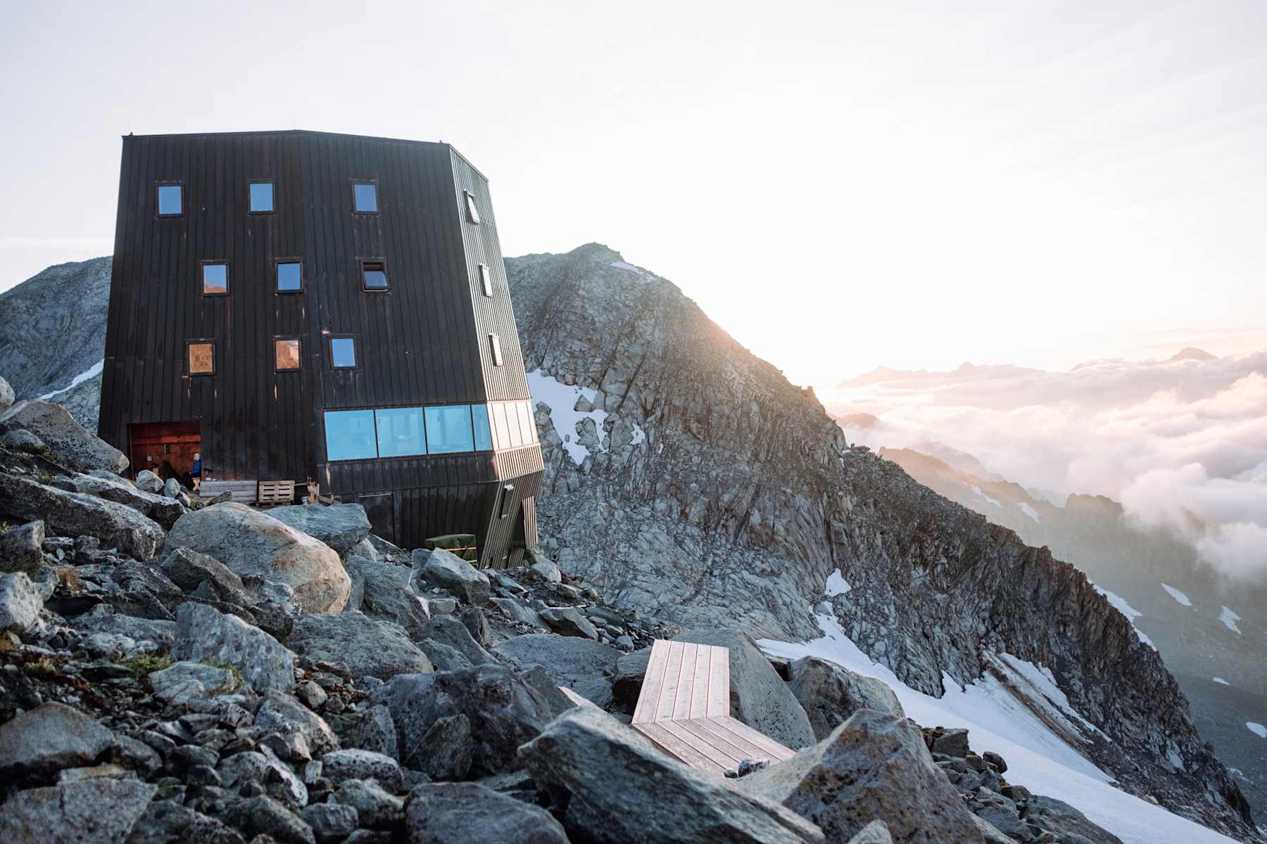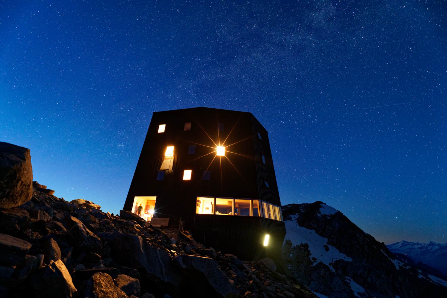 Die Schwarzensteinhütte sieht nicht wie eine typische Berghütte aus. Trotzdem fühlt man sich in dem modernen Bau sofort wohl. Foto: Michael Pezzei, Bergwelten Magazin 03-2020 Die sonnige Gaststube der Schwarzensteinhütte Foto: Margit Ainhauser, Schwarzensteinhütte Wenn es Nacht wird auf der Schwarzensteinhütte Foto: Margit Ainhauser, Schwarzensteinhütte Klettersteig-Passagen auf dem Weg zur Schwarzensteinhütte Foto: Michael Pezzei / Red Bull Media House Publishing Schwarzensteinhütte Foto: Michael Pezzei / Red Bull Media House Publishing Wegweise zur Schwarzenstein Hütte Foto: Michael Pezzei / Red Bull Media House Publishing Bildergalerie (6)