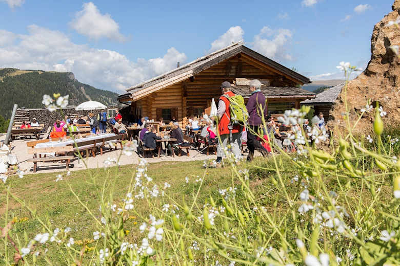 Die Seiseralm ist ein Wanderparadies. Hier findet man 450 Kilometer Wanderwege zu verschiedenen Almen und Hütten. Dabei begeistert immer wieder der Blick zum mächtigen Langkofelmassiv.