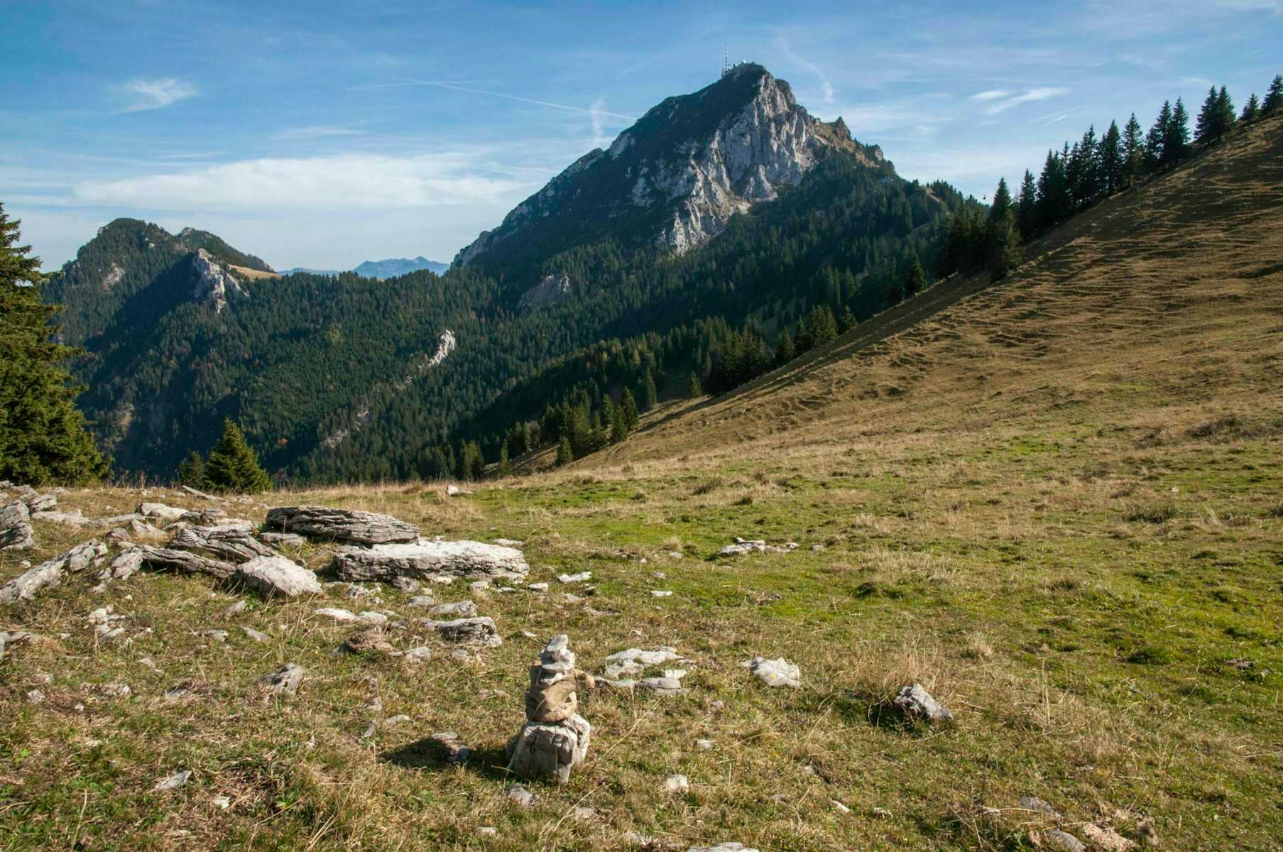 Nach der Auffahrt mit der Seilbahn von Osterhofen oder der Zahnradbahn von Brannenburg sollte man dem Wendelsteingipfel (1.838 m) noch einen Besuch abstatten. Die Aussicht von diesem freistehenden Gipfel ist wirklich beeindruckend und reicht bis in die Hohen Tauern. Anschließend steigt man auf steilem Weg in südwestlicher Richtung unterhalb der Seilbahn bergab, bis man an eine Wegverzweigung kommt. Hier geht man nach rechts und trifft am Fuße des Wendelsteins auf den quer verlaufenden E4. Man biegt nach links ab und wandert zur Wegteilung vor der Elbach Alm.