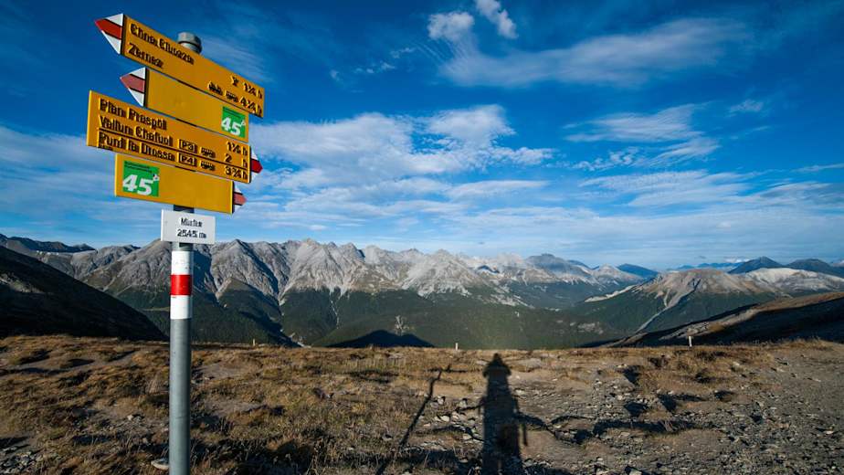 Der Murtersattel (2.545 m) ist kurz darauf erreicht, wo einem oft ein zügiger Wind umbläst. Ein wunderbarer Blick in das Spöltal und auf die Engadiner Dolomiten eröffnet sich einem.