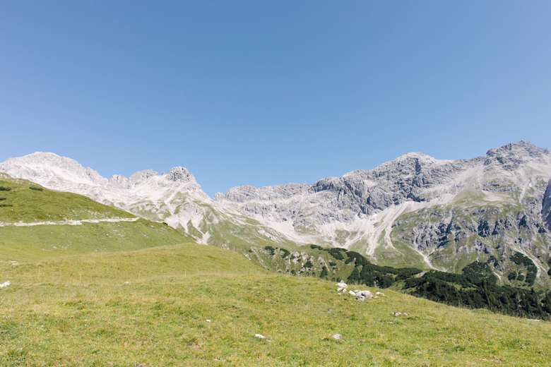 Zustieg zur Göppinger Hütte am Gamsbodenjoch zwischen oberem Lechtal und Großem Walsertal im Vorarlberger Lechquellengebirge. Das Lechquellengebirge ist das Gebirgsmassiv zwischen Rätikon im Westen und Lechtaler Alpen im Osten.