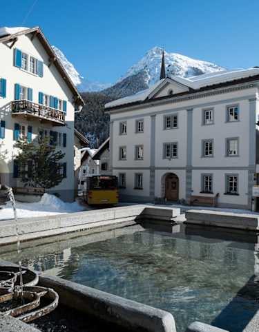 Kostenlose Parkplätze am Bahnhof, im Dorf sowie beim Besucherzentrum des Nationalparks in Zernez.