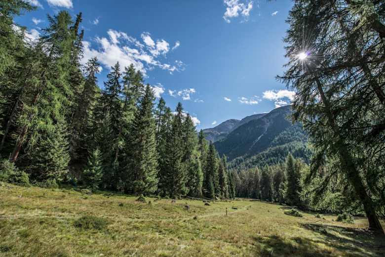 Die Lichtung von Margun Grimmels erinnert an die ehemalige Alp. Foto: Schweizerischer Nationalpark, Hans Lozza, Tourismus Engadin Scuol Samnaun Val Müstair AG