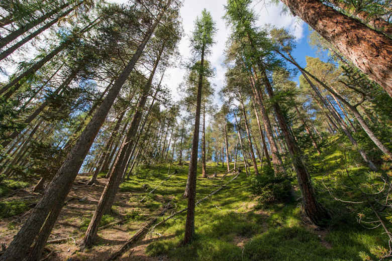 Im Aufstieg von Margun Grimmels zur Ofenpassstrasse durchqueren wir stattliche Lärchen-Waldföhrenbestände. Foto: Schweizerischer Nationalpark, Hans Lozza, Tourismus Engadin Scuol Samnaun Val Müstair AG Bildergalerie (3)