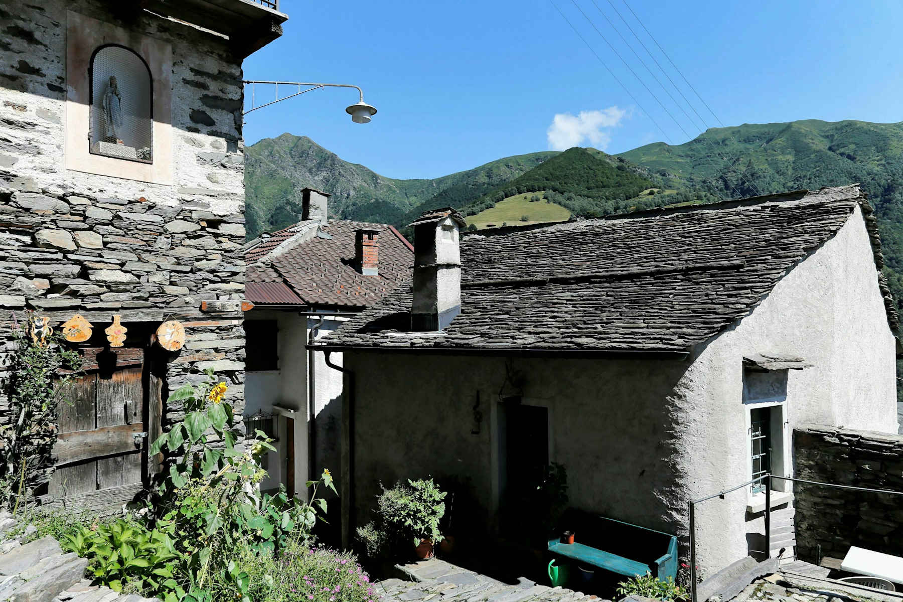 Die kühle Luft der weiten Wälder ist auch während des Abstieges zum beeindruckenden Dorf Indemini zu spüren, welches durch seine Lage, die vielen malerischen Ecken, das Labyrinth schön gepflasterter Gässchen, die Arkaden und die Torbögen unter den rustikalen Häuschen mit ihren Holzlauben nach wie vor imponiert.