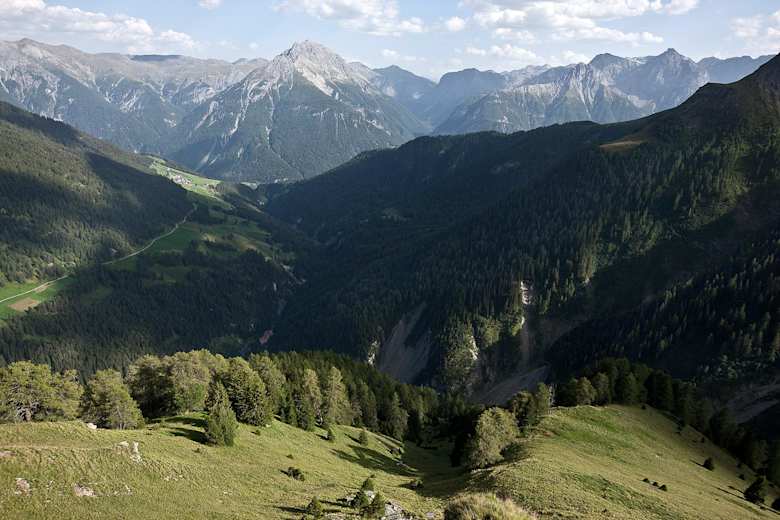 Die letzten Höhenmeter vor der Fuorcla Maisas werden noch einmal knackig steil bis man am schmalen Grat angekommen ist. Hier geniesst man den weiten Ausblick ins Val Maisas und zurück zum Val Sinestra. Man geht ein kurzes Stück am Grat entlang bevor der Weg steil in das Val Maisas abfällt. Der Weg führt in einem moderaten Gefälle über die Alpwiesen dem Bach entlang in Richtung Talausgang. Erreicht man einen Alpstall, mündet der Weg wieder in die Alpstrasse. Dieser folgend, gelangt man durch den Wald hinab nach Samnaun Dorf. Von hier gibt es eine PostAuto-Anbindung über Martina nach Scuol, oder über Ramosch zurück nach Vná.