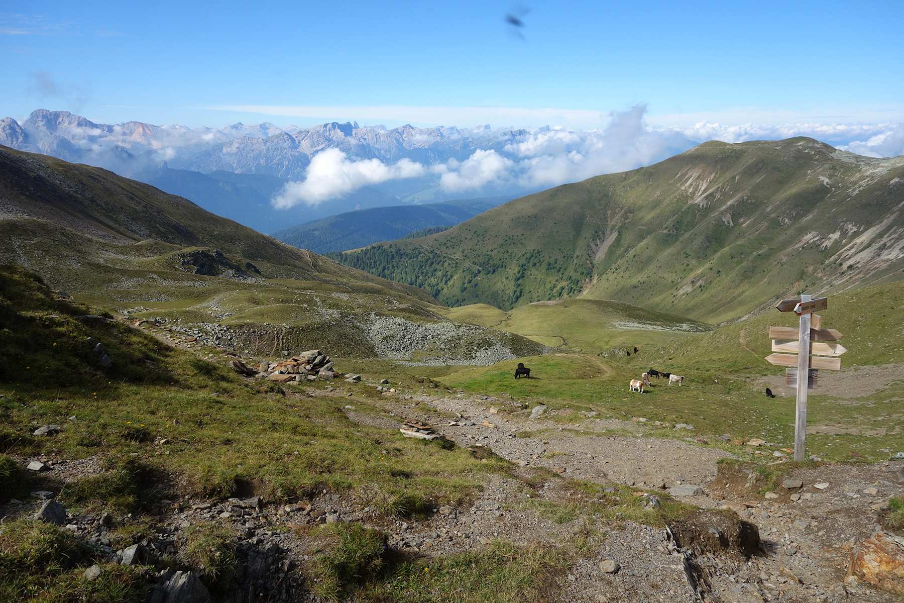 Beim Pfanntörl verlässt man kurz den Bonner Höhenweg und geht am felsdurchsetzten Kamm Nr. 8 entlang auf das Toblacher Pfannhorn (2.663 m) mit beeindruckendem Rundblick auf die Südtiroler-Sextener Dolomiten, den Karnischer Kamm, den Großglockner und den Großvenediger.