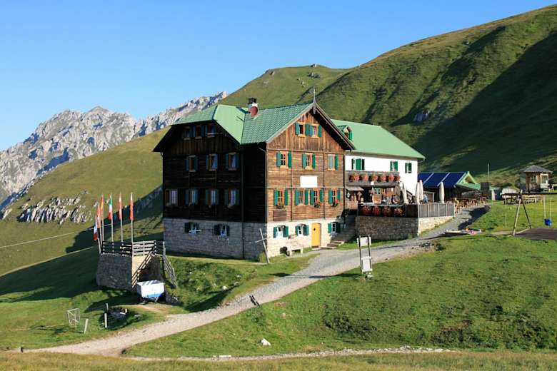 Hier kann man sich mit hausgemachten Käsespezialitäten stärken (auch Verkauf), bevor es mäßig ansteigend -weiterhin auf Weg 32 - über offenes Gelände hoch zur Schlüterhütte (2.306 m) geht.