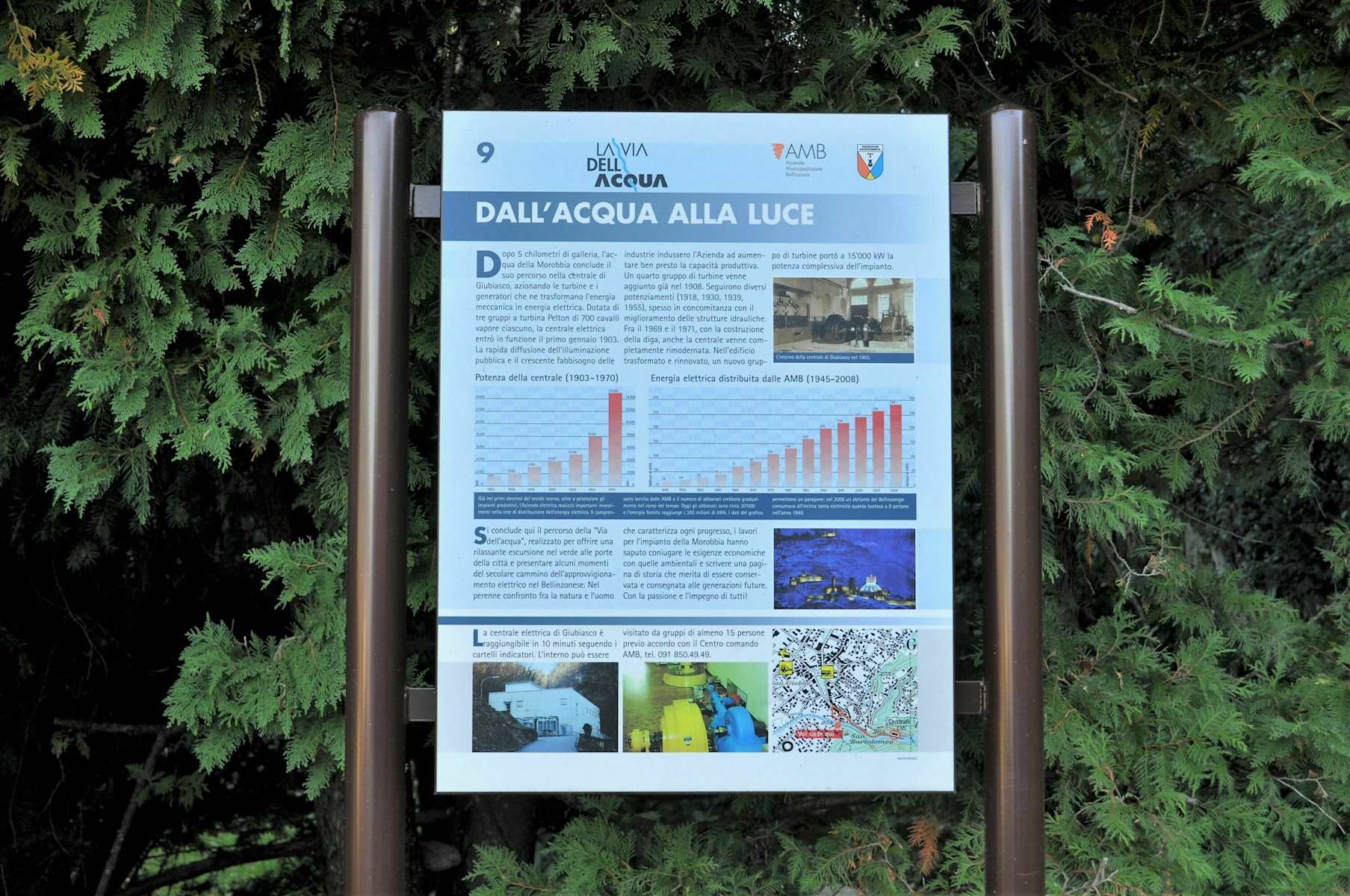 „Der Weg des Wassers“ ist ein spannender Naturlehrpfad, welcher in Kooperation zwischen den AMB (Städtischen Werke) und der Region des Morobbiatals entstanden ist. Neun Informationstafeln mit Beschreibungen und Bildern erklären die Geschichte wie auch die Energieproduktion der Wasserkraftwerkanlage der Morobbia.