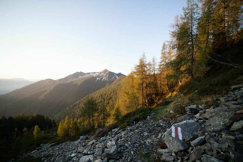 Nach einer kurzen Rast geht es nun in Richtung Süden und man wandert entlang der Waldgrenze bis man nach rund 3 km das Etappenziel, die Alp da Canaa erreicht.
