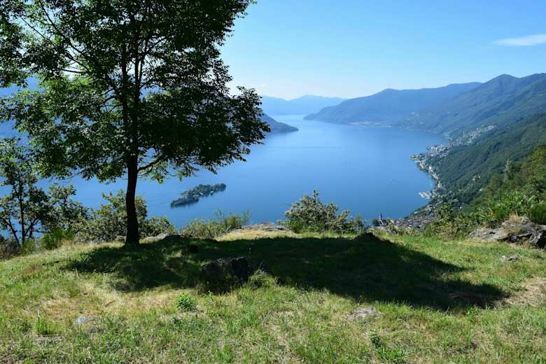 Der Weg führt durch zauberhafte Kastanienwälder und über idyllische Alpen hinauf zum Ziel, von wo aus man einen wunderbaren Blick auf den Lago Maggiore, das Maggia-Delta und die Gipfel der Tessiner und Luganer Alpen genießen kann.