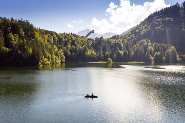 Vorbei an der kleinen Siedlung, kommt auch im weiteren Verlauf der Wanderung keine Langeweile auf. Eine Besichtigung der unweit gelegenen Heini-Klopfer-Skiflugschanze ist luftig und beeindruckend. Im Anschluss führt der Dr.-Reh-Weg auf der rechten Seite des Freibergseekessels weiter nach Norden. Im dichten Wald macht das Funkeln und Schimmern der grünen Wasseroberfläche neugierig. Für alle, die den malerisch liegenden See in seiner ganzen Pracht bestaunen möchten, lohnt sich ein kurzer Abstecher zum Seeblick, nördlich-oberhalb des Sees gelegen. Der finale Teil der Wanderung führt über einen etwas steileren, waldigen Abstieg bis zur unteren Renkstegbrücke. Von hier geht es auf den sonnigen Wiesenwegen durch das Ösch zurück nach Oberstdorf.