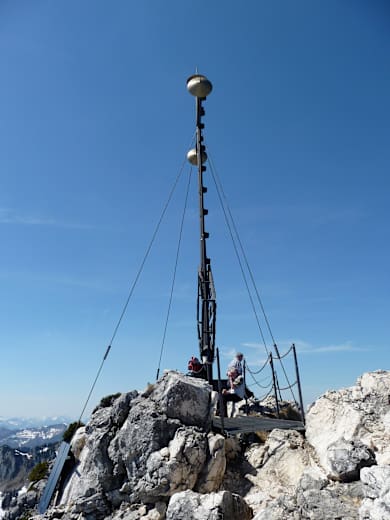 Ein seilversicherter Abschnitt und eine Eisenbrücke führen schließlich zum Ostgipfel der Kampenwand mit ihrem mächtigen Gipfelkreuz.