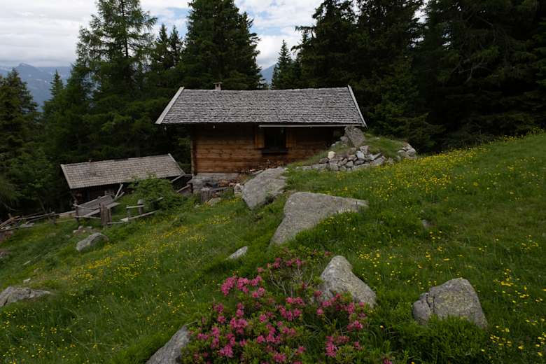 Nach der Gipfelpause geht man zurück bis zur Abzweigung und passiert dann die Almhütten Lenzeben. Über einen waldigen Rücken steigt man hinunter zum Taser Höhenweg.