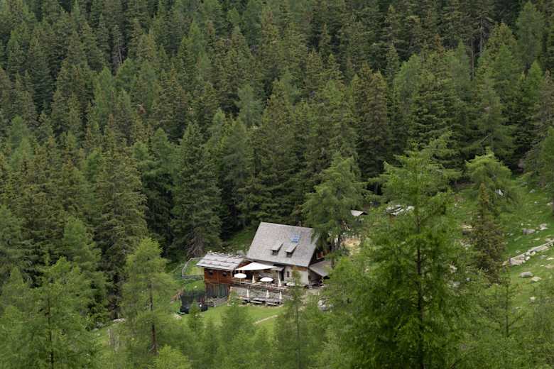 Noch einmal etwas steiler steigt man hinauf zur Hütte, an der man erst einmal eine Pause einlegt. Sie liegt eindrucksvoll unter den Felsen es Ifinger Massivs. Von der Hütte folgt man dem Steig durch den Wald bis zu einer kleinen Lichtung an den Almhütten der Lenzebenalm.