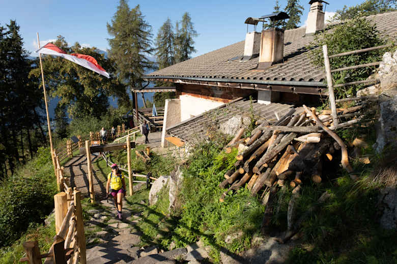 Nach einem Zwischenabstieg überquert man einen Bach und erreicht die Leiteralm. Von hier erreicht man in wenigen Minuten die Bergstation des Korbliftes von Vellau. Wer möchte kann mit diesem hinunterschweben.