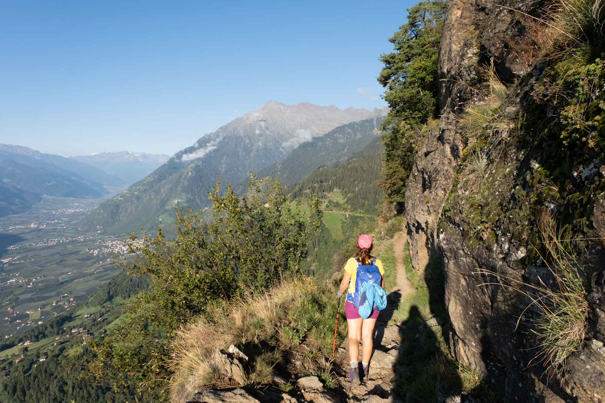 Von hier folgt man dem Meraner Höhenweg zum nahen Gasthaus Steinegg. Hier beginnt der Hans-Frieden-Weg. Auch dieser ist zu Beginn teilweise versichert.
