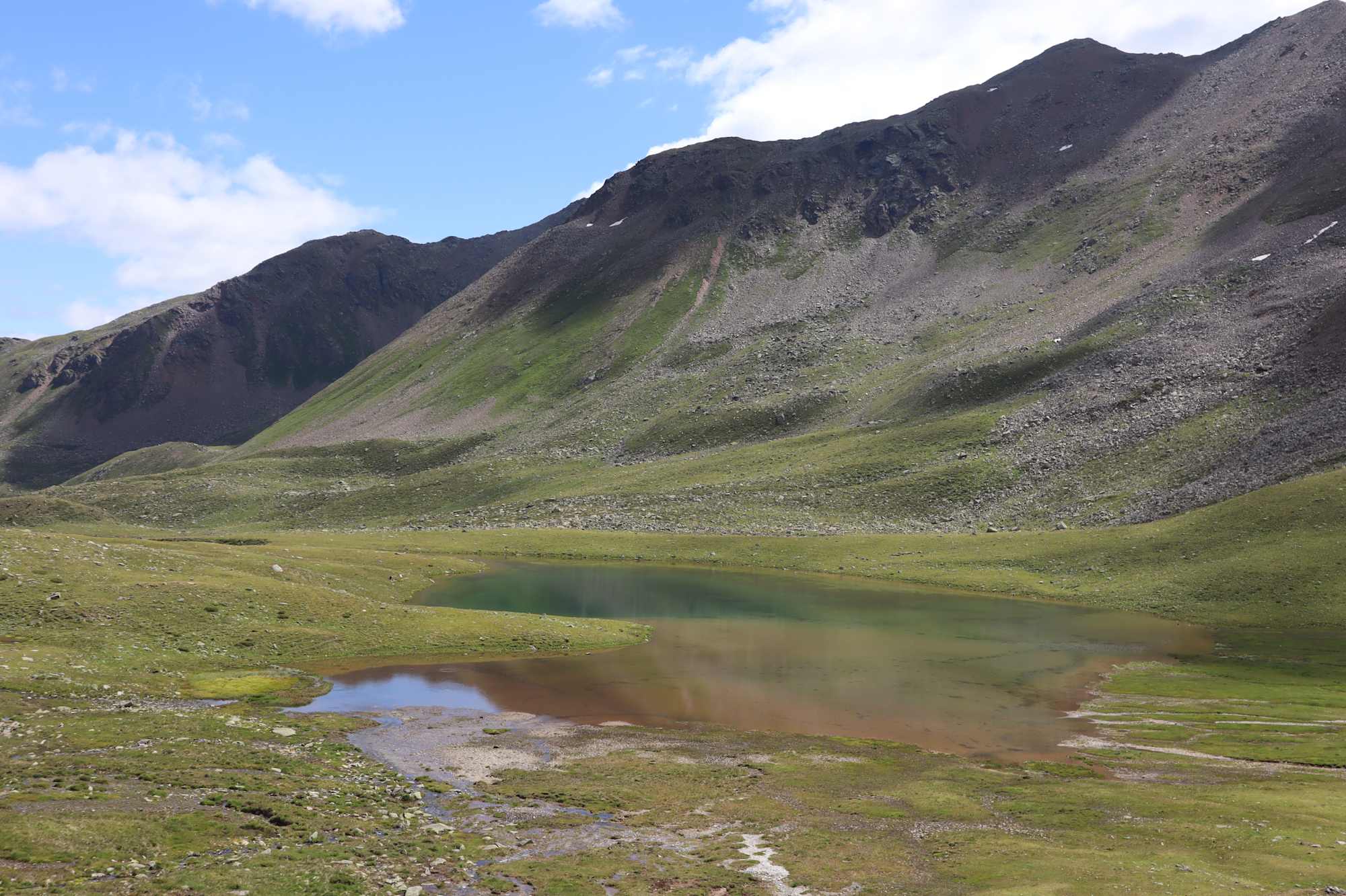 Auf einem Plateau mit großen Felsblöcken und Steinmännchen biegt man links ab und steigt durch das Almgelände weiter bergab. Nördlich des Langsees trifft man auf den Weg Nr. 107, dem man nach links über eine kleine Geländestufe folgt. Der Abstieg verläuft sanft über die welligen Almböden hinunter zu einem kleinen See bei der Oberen Weißbrunnalm (auch als Ober Alm bekannt).