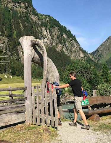 Kurze Zeit später gelangt man zum Lacheggbach, der immerhin über eine stabile Brücke überschritten werden kann. Hier zweigt der Erfurter Weg zum Hocharn linker Hand ab. Man hält sich aber rechts und bleibt am Wasserfallrundweg, der nun abwärts über teils etwas felsiges Gelände und dann über die Almwiesen führt. Das letzte Stück geht es gemütlich hinunter zur Straße. Man hält sich rechts und kann so bequem wieder zurück zum Naturfreundehaus mit Einkehrmöglichkeit und der Bushaltestelle gleich vor der Haustüre wandern.