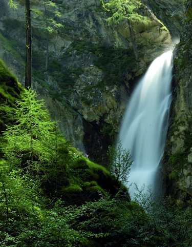 Nach der Hängebrücke führt der markierte Steig aufwärts und nach rund 15 Minuten kann man einen kurzen Abstecher zum Kaskadifall machen. Wieder zurück am Weg, folgt man diesem weiter durch lichten Wald und über einige feuchte Wiesen. Entlang des Baches erreicht man bald den nächsten Wasserfall, den man mittels Holzbrett überquert.