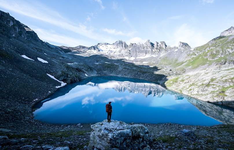 Hinter der Wildseelücke (2.493 m) geht es zum idyllischen Wildsee. Das Panorama mit dem Pizolgletscher, dem Pizolgipfel (2.844 m) und den Grauen Hörnern ist absolut atemberaubend und das ein oder andere Foto wert.