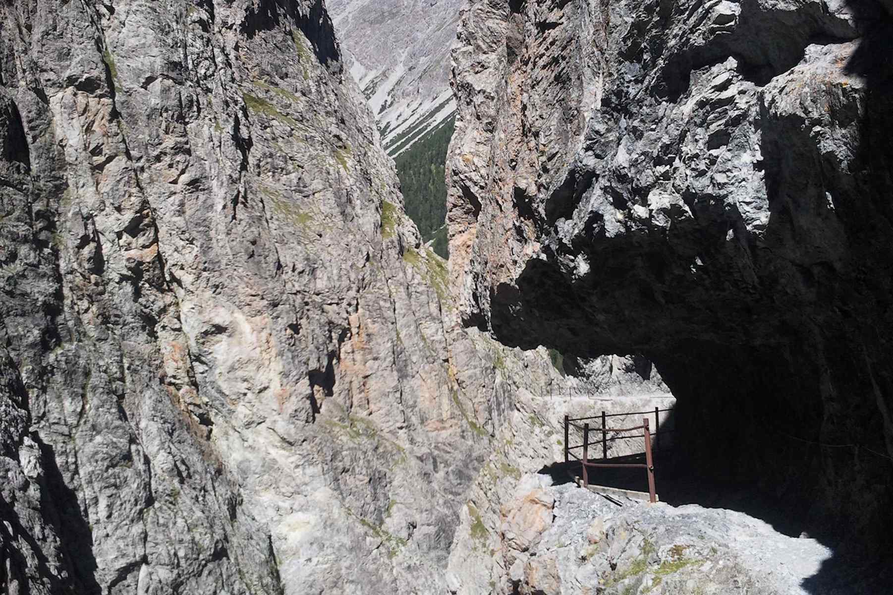 Nun wird der Weg deutlich steiler bis zur Fuorcla Sesvenna. Immer die Sesvennahütte vor sich, erreicht man bald das von Bergwiesen geprägte Valle di Slingia und weiter die Hütte auf italienischen Boden, welche im Sommer bewirtschaftet ist. Zurück in die Schweiz gelangt man über den Schlinigpass. Vorbei an der Alp Sursass geht es weiter zum schmalen Eingang in den Felsenweg "Il Quar". Der in die steile Felswand gesprengte, rund 600 m lange Weg, wurde anfangs des zwanzigsten Jahrhunderts als Zugang zur Pforzheimerhütte angelegt. Von hier eröffnet sich eine herrlicher Ausblick in das Val d'Uina, in welches man nun absteigt.