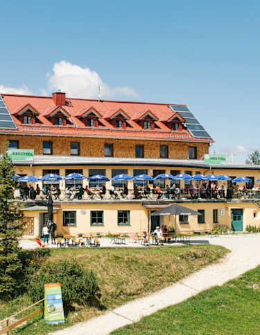 Am Ziel angelangt hat man einen grandiosen Ausblick in das Loisachtal und in die Weite über das Ammergebirge. Wer noch den höchsten Gipfel der Bayerischen Voralpen besteigen möchte, schafft bestimmt auch noch diese 130 Höhenmeter und kehrt erst anschließend in der Hütte ein, wo es köstliche Wildgerichte zu genießen gibt!