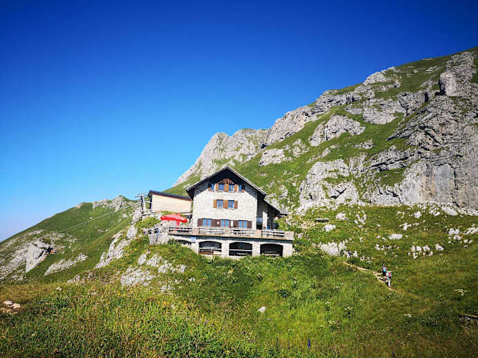 Der Pfad führt weiter in südöstliche Richtung, hinunter zur Bad Kissinger-Hütte auf einer Höhe von 1.788 m. Für diesen letzten Wegabschnitt ist Trittsicherheit notwendig!