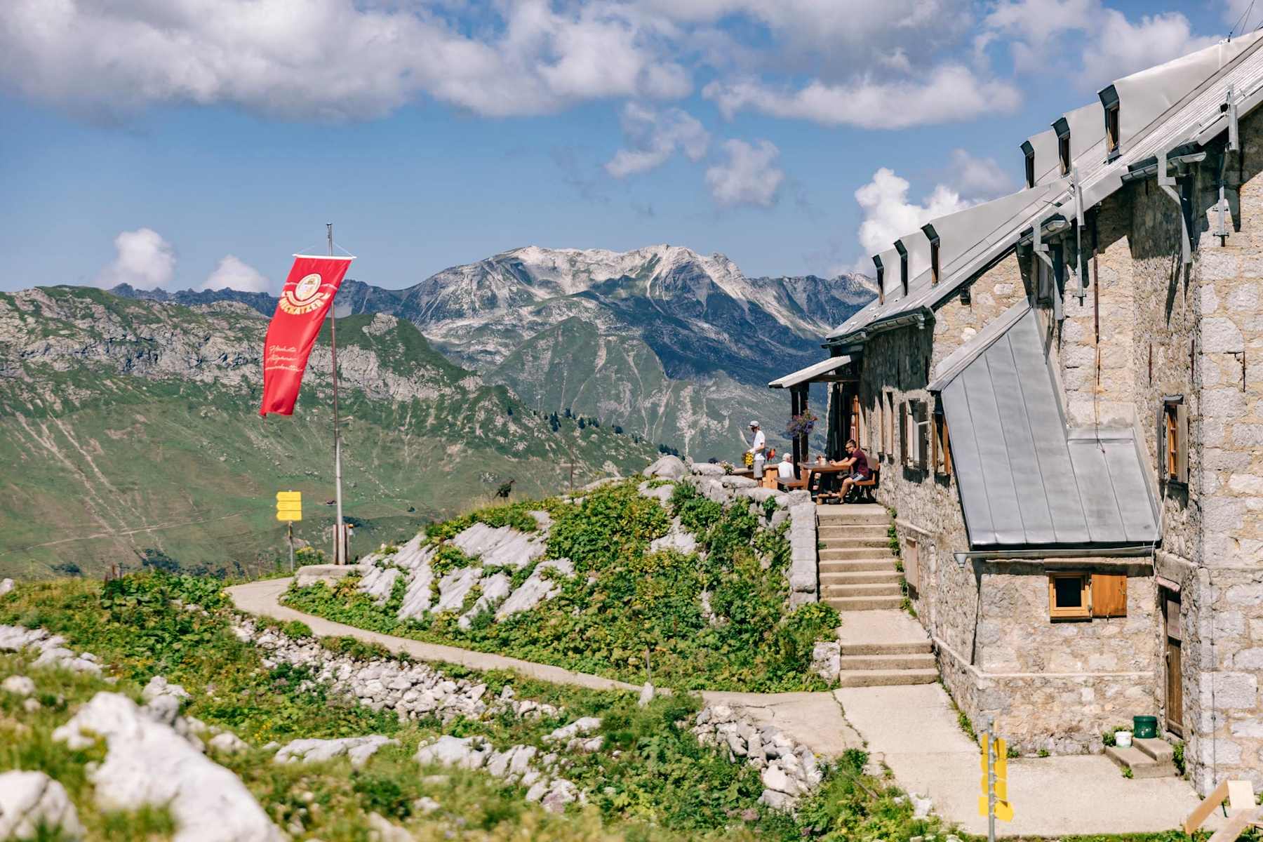 Die 1880 erbaute DAV-Hütte liegt unterhalb des Hochvogels (2.593 m) und bietet neben Allgäuer Hüttenküche auch gemütliche Lager mit Ausblick auf die Gipfelkette. Ein Klassiker unter den Hüttenzustiegen – landschaftlich reizvoll und alpingeschichtlich bedeutend.