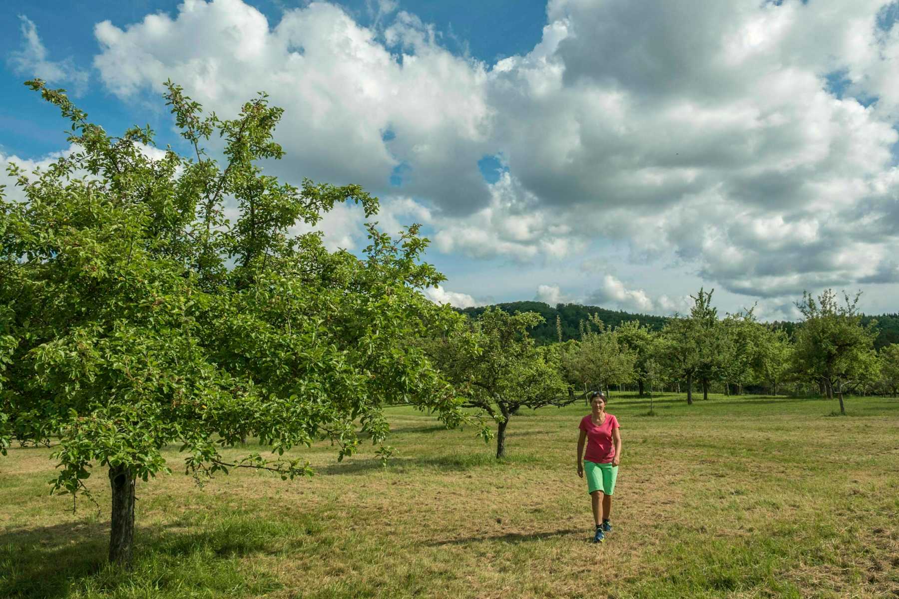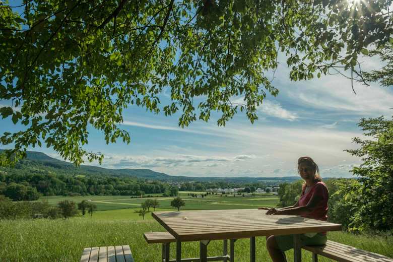 Auf der gegenüberliegenden Seite steigt man auf dem Steig steil hinunter zu den Streuobstwiesen von Öschingen. Zuerst in südöstlicher, ab einer Panoramaliege dann in westlicher Richtung spaziert man auf dem breiten Weg durch die Wiesen. Man verlässt den nach links abzweigenden Schotterweg und wandert geradeaus weiter.