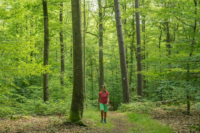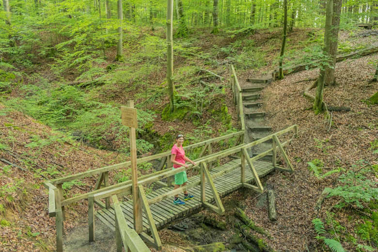Hier wendet man sich nach rechts in den Wald und erreicht die nächste Bank am Barfußpfad des NABU. Auf dem breiten Forstweg wandert man im Wald aufwärts, bis man auf einen nach rechts abzweigenden Forstweg einbiegt. Diesen verlässt man bald und geht nun das schöne Jägerwegle entlang. Zwei Holzstege und Brücken führen über Bacheinschnitte.
