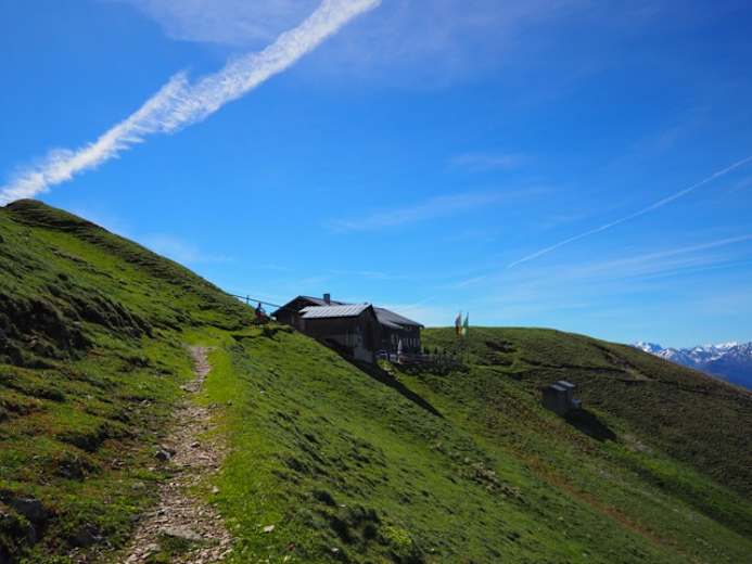 Durch die Latschen und zum Teil etwas schorfiges Gelände geht es noch einmal kräftig bergan, bis man schließlich die Nördlinger Hütte in toller Aussichtslage auf 2.238 m erreicht.