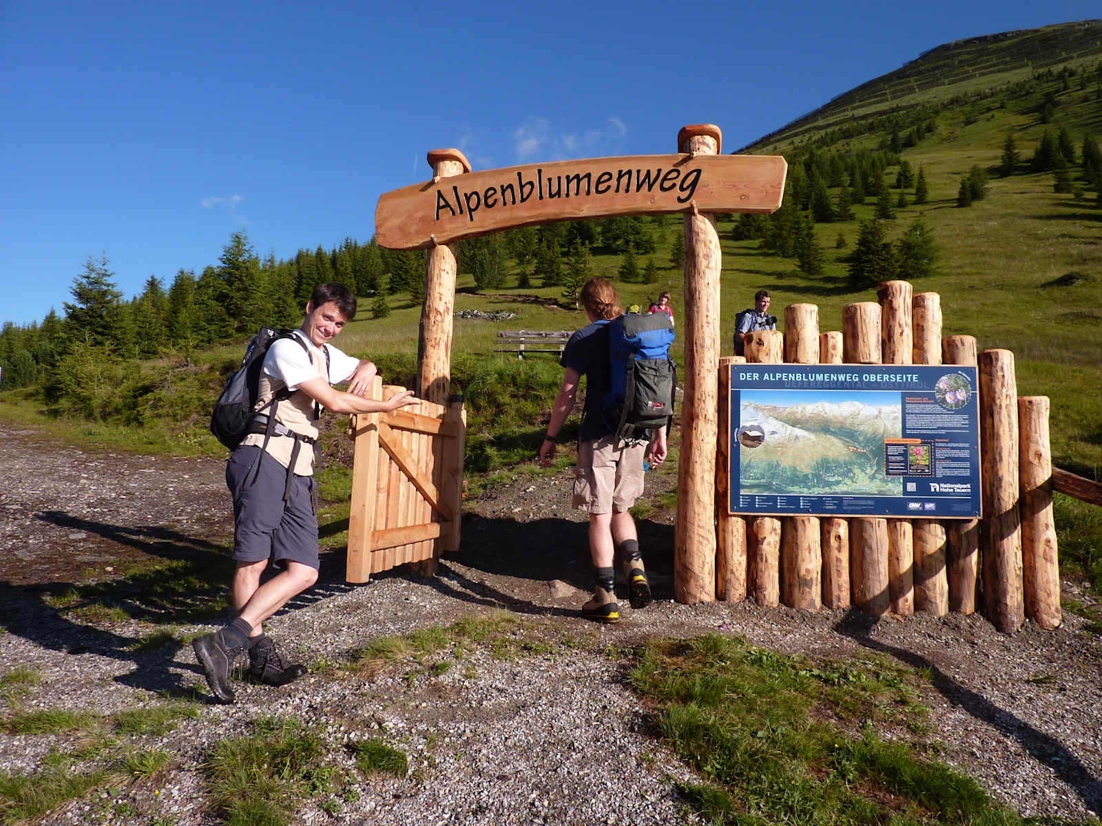 Ein kurzes Stück führt der Weg entlang des Trojer Almbaches taleinwärts bis zum Beginn des Blumenweges. Über die Holzbrücke geht es in Serpentinen durch den Wald mäßig steil bergauf. Über der Waldgrenze angekommen, folgt manb dem leicht ansteigenden Pfad über die ausgedehnten Bergmähder der Oberseite zu der nicht mehr bewirtschafteten Oberseitalm.