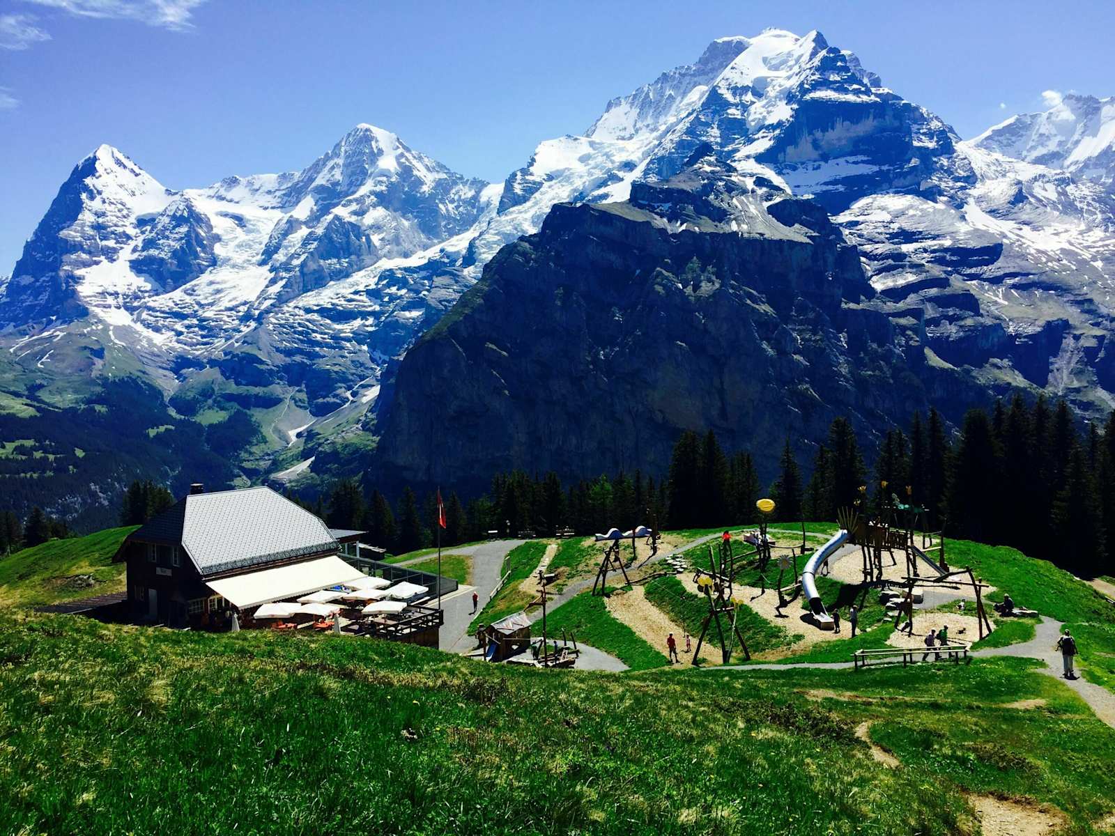Die ideale Familienwanderung in der Jungfrau Region, die auch mit dem Kinderwagen bewältigt werden kann: In einer knappen Stunde erreicht man von Mürren (1.638 m) den Allmendhubel (1.909 m), wo sich die Kleinen auf dem Abenteuerspielplatz austoben können. Alle anderen geniessen den Blick auf das Berner-Alpen-Dreigestirn Eiger, Mönch und Jungfrau, das zum Greifen nah scheint.