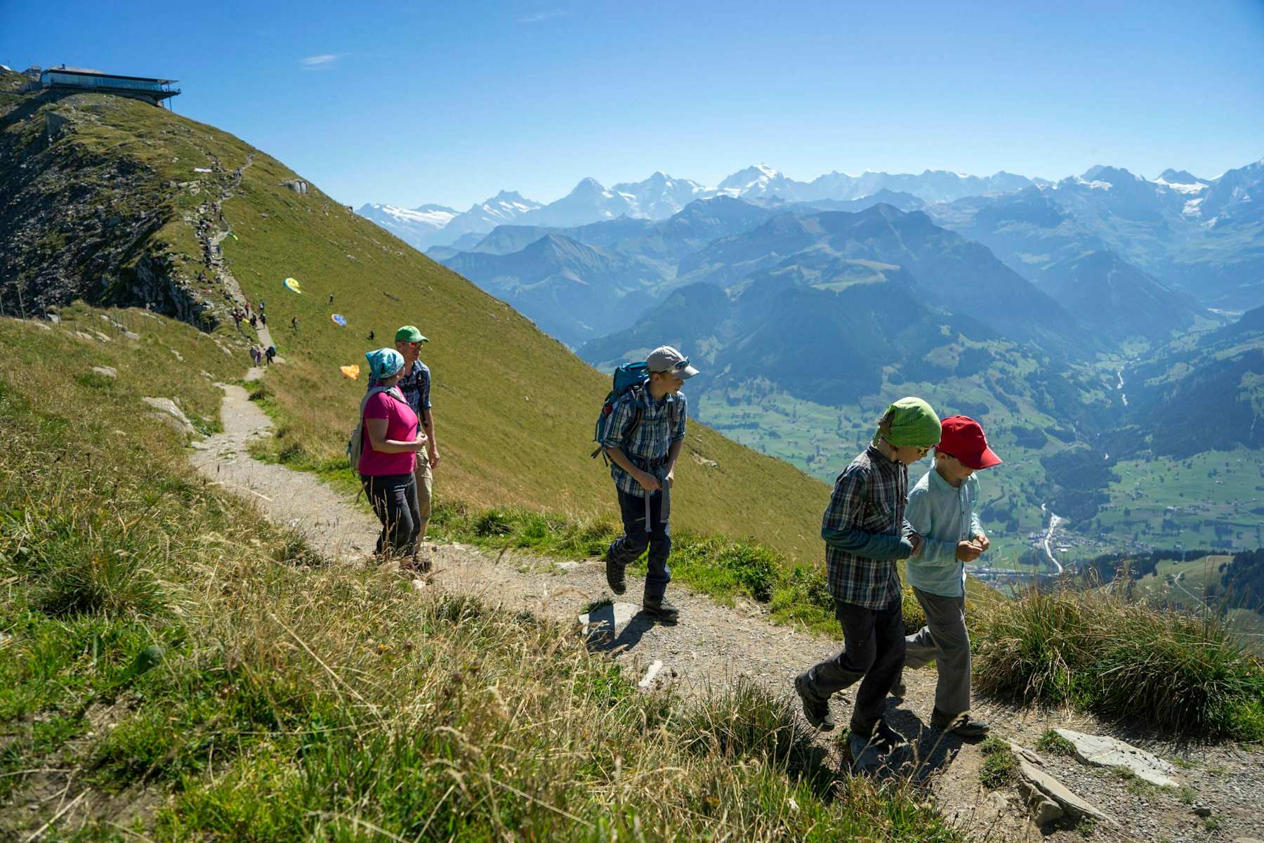 Nach einer kurzen Verschnaufpause am Gipfel gestaltet sich der Abstieg deutlich weniger steil. Auf der Nordseite des Berghotels geht man am Startplatz der Gleitschirmflieger vorbei Richtung Niesengrat.