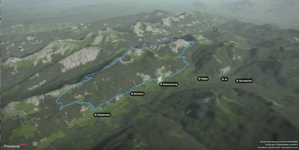 Oberhalb eines Gehöfts biegt man links in den Höhenweg ein, der Wanderer parallel zur Talstraße ostwärts Richtung Balderschwang bringt. Zwischendurch kommt man am Weiler Gschwend, 1.090 m, und einer größeren Hotelanlage vorbei, dann hat man den Ausgangspunkt erreicht.