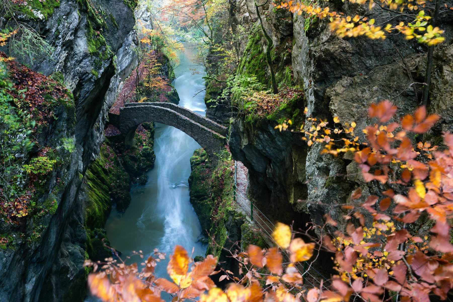 Schluchtenwanderung im Schweizer Kanton Neuenburg entlang der Areuse, die selbst an heissen Sommertagen für eine kühle Brise und feinen Sprühregen sorgt. Der Wanderpfad ist geschickt angelegt und ermöglicht tiefe Einblicke in das Naturschauspiel.