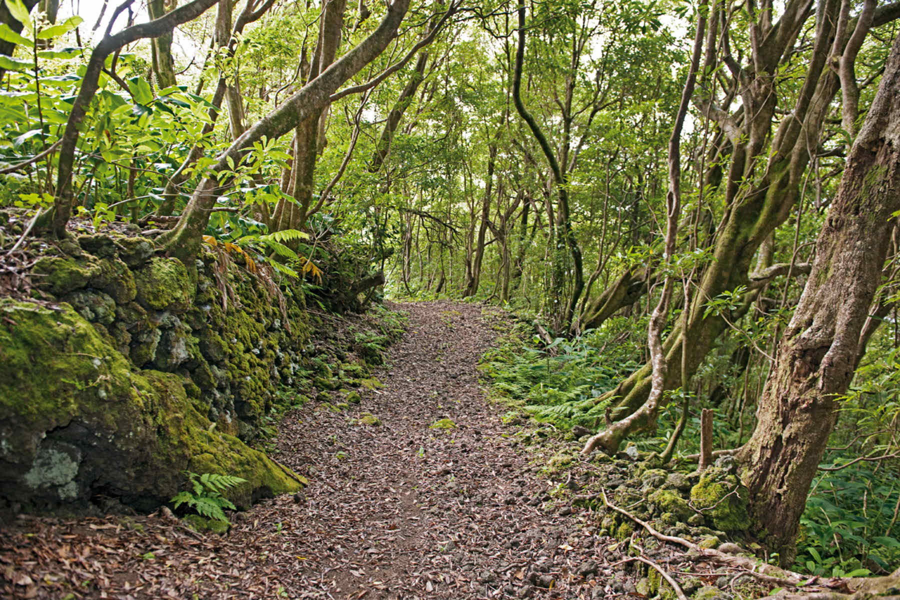 Aussicht mit Rundumblick und alte Schiffsbaukunst: Vom Aussichtspunkt Terra Alta mit Panoramablick auf São Jorge führt der noch gut erhaltene, alte Pflasterweg der Nordküste durch den Wald hinab an die Küste.