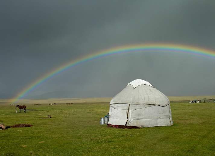 Kirgisische Yurte auf einer Hochalm („Jailoo“) im hohen Tien-Shan. Das Wetter kann sich im Tien-Shan sehr rasch ändern, eine rasche Abfolge von Sonnenschein und sehr schnell vorüberziehenden Gewittern biete aber auch einzigartige Lichtspiele. Foto: Clearskies