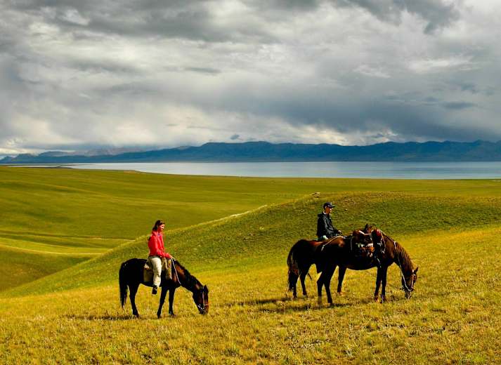 Die weiten Almwiesen um den azurblauen Hochgebirgssee Son-Kul werden seit Jahrhunderten von den zentralasiatischen Nomaden als Sommerweiden für ihre Pferdeherden genutzt. Es empfiehlt sich, für ein paar Stunden ein Pferd zu mieten um die weitläufige Umgebung zu erkunden. Foto: Clearskies