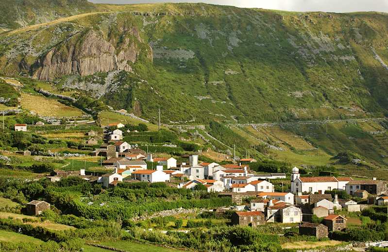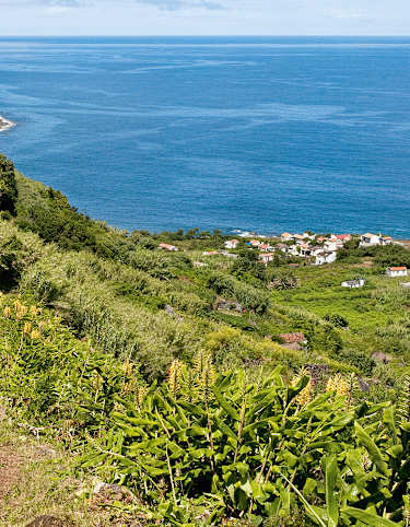 Nachdem der Weg sich wieder verflacht, geht man 50 m vor einer Brücke links auf einem Grasweg weiter und auf ein Natursteinhaus zu (Wasserhahn rechts). Bei der Gabelung dahinter nach rechts und auf einem Hohlweg schließlich wieder hoch zur Straße. Ihr folgt man nun links 5 Min. lang etwas mühsam den Hang hinauf. Wo es flacher wird, biegt man links auf einen Grasweg ab. Bald ist man oben angekommen und kann den Abstieg nach Fajãzinha auf alten Pflastern beginnen (rechts lohnt noch ein kurzer Abstecher hinauf zum Aussichtspunkt auf Fajãzinha).