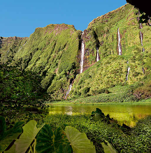 Zum Poço das Patas (1,3 km; 25 Min.): Vor dem Ribeira do Ferreiro rechts dem Grasweg folgen (Schild: Poço da Alagoínha). Er geht gleich in einen alten Pflasterweg über. Durch den Wald erreichen wir in gut 15 Min. das Ufer des bei den Einheimischen als Poço das Patas bekannten Sees. Er wird von den unzähligen Wasserfällen des Ribeira do Ferreiro gespeist. Anschließend zurück.
