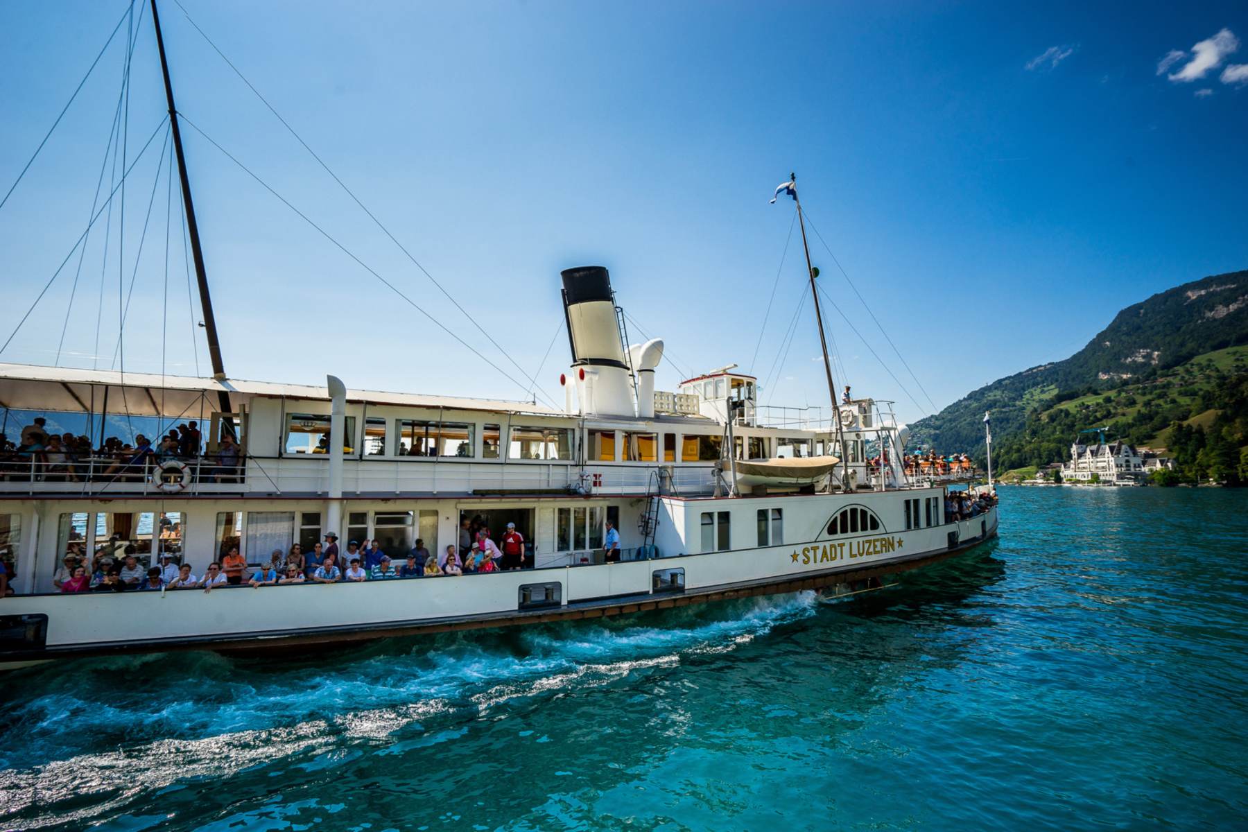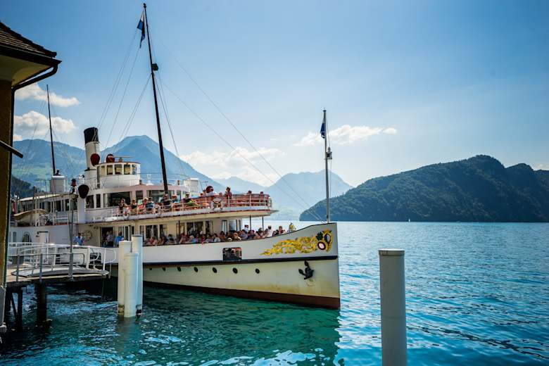 Dampfschiff Stadt Luzern bei der Station Vitznau am Wanderweg Waldstätterweg, Etappe 1 Brunnen-Vitznau Foto: Outsideisfree.ch