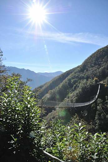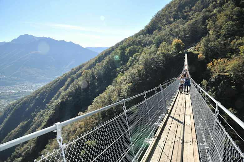 Danach geht es durch Wälder ein gutes Stück aufwärts bis zum höchsten Punkt der Tour auf 791 m. Jetzt folgt der nächste Höhenpunkt: die Überquerung der längsten tibetischen Brücke der Schweiz. Mit gewaltigen 270 m spannt sie sich schwindelerregend über das Valle di Sementina.