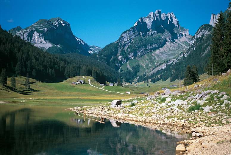 Ein Pfad bringt Wanderer zu dem auf einer Kuppe gelegenen Gasthaus Plattenbödeli (1.279 m) mit Kapelle und kurz hinter der Einkehr hinunter zum Sämtiser See (1.209 m). Kühn bäumt sich über diesem begeisternden Bergauge der Turm der Stauberenkanzel auf. Weiter geht es am malerischen Seeufer Richtung Hoher Kasten. Aus einer Weidemulde steigt ein Ziehweg an über Lichtungen, von dem bald ein Waldsteig abzweigt. Dieser führt zur Alp Grueben (1.370 m).