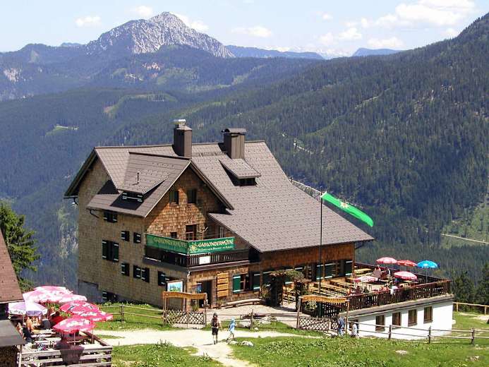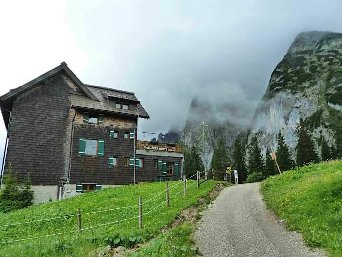 Wer mag, kann alternativ mit der Gosaukammbahn bis zur Bergstation fahren – von dort ist es nur ein kurzer Fußmarsch bis zur Hütte.