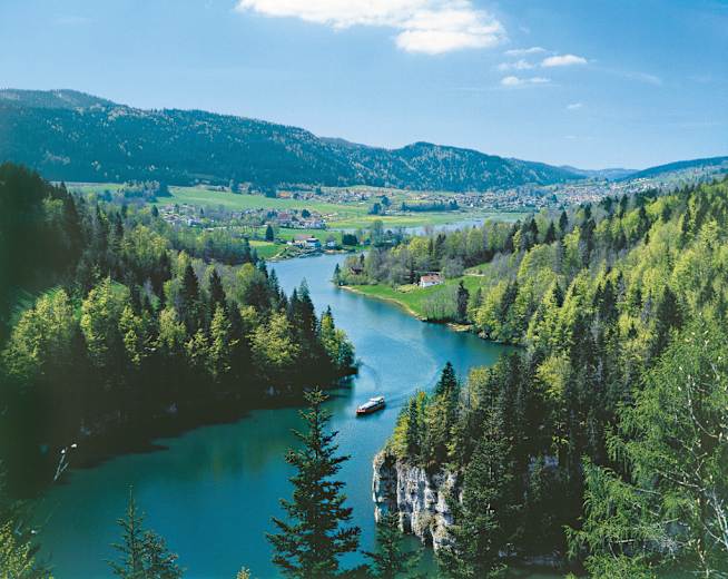 Vom Ferienort Les Brenets aus wandert man mehrheitlich durch den Wald flussabwärts. Immer wieder erblickt man den im Seebecken fliessenden Doubs. Unzählige Lehrtafeln beleuchten vier Jahrhunderte Industriegeschichte der Gegend. Allmählich wird die Uferpartie felsig, der Weg steigt an. Der Lac de Brenets ist auch bekannt für seine Höhlen. Felsspringer haben hier schon diverse Rekorde aufgestellt.
