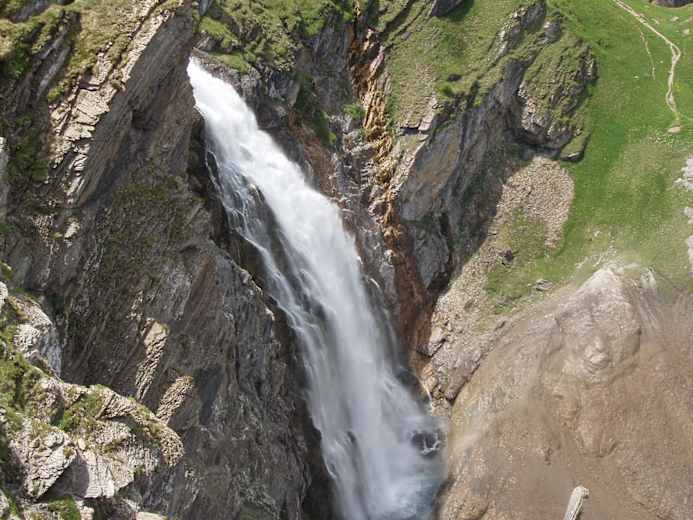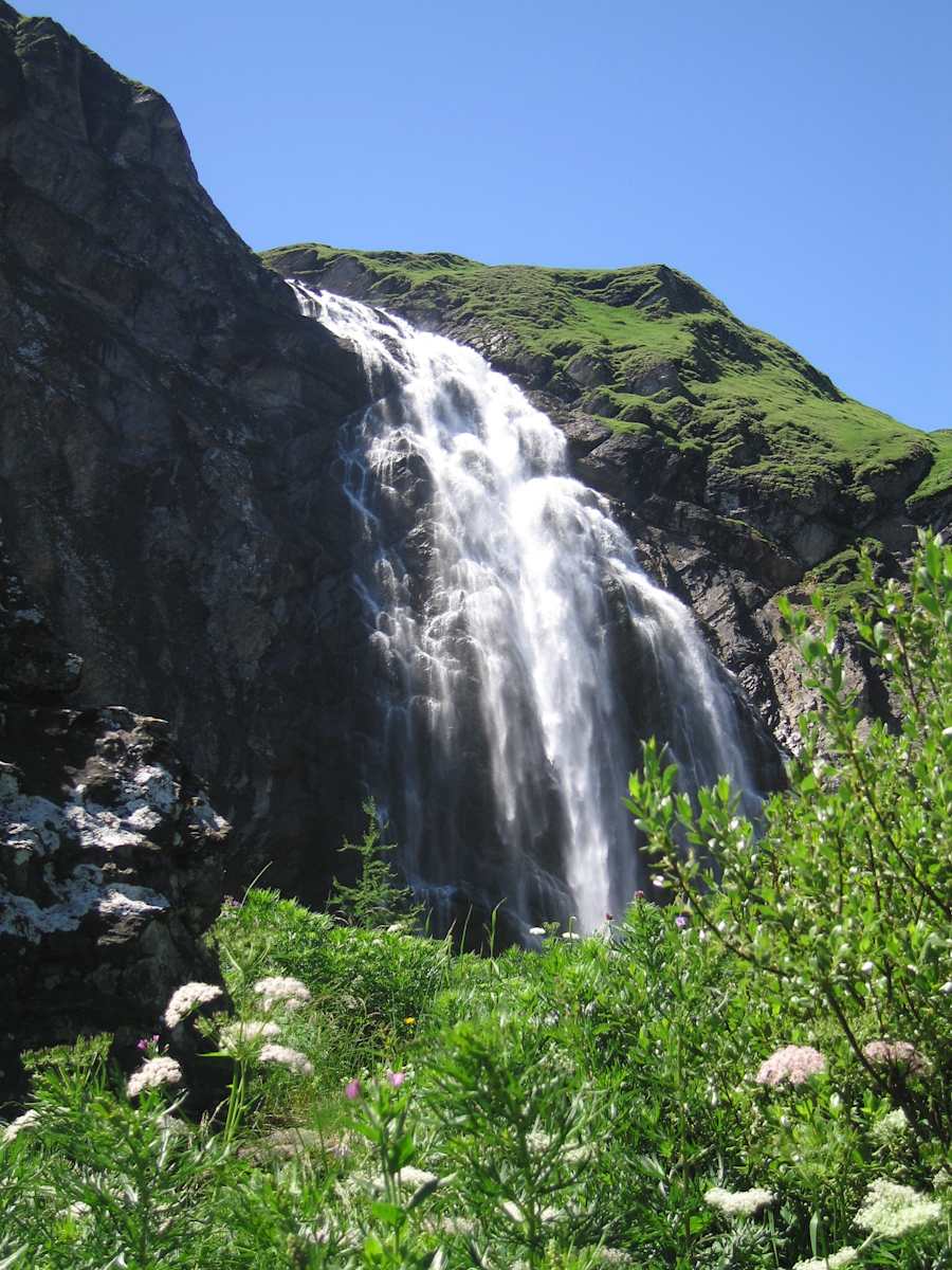 Von dort geht es zunächst einige Höhenmeter unter der Bahn entlang. Auf ca. 1.650 m hält man sich rechts und quert die Bahntrasse. Kurz darauf folgt eine Abzweigung: Der linke Pfad führt auf direktem Weg zur Engstligenalp. Unbedingt empfohlen und hier im GPS-Track beschrieben ist jedoch der rechte Weg, auf dem man innerhalb kurzer Zeit zu den Engstligenfälle gelangt.